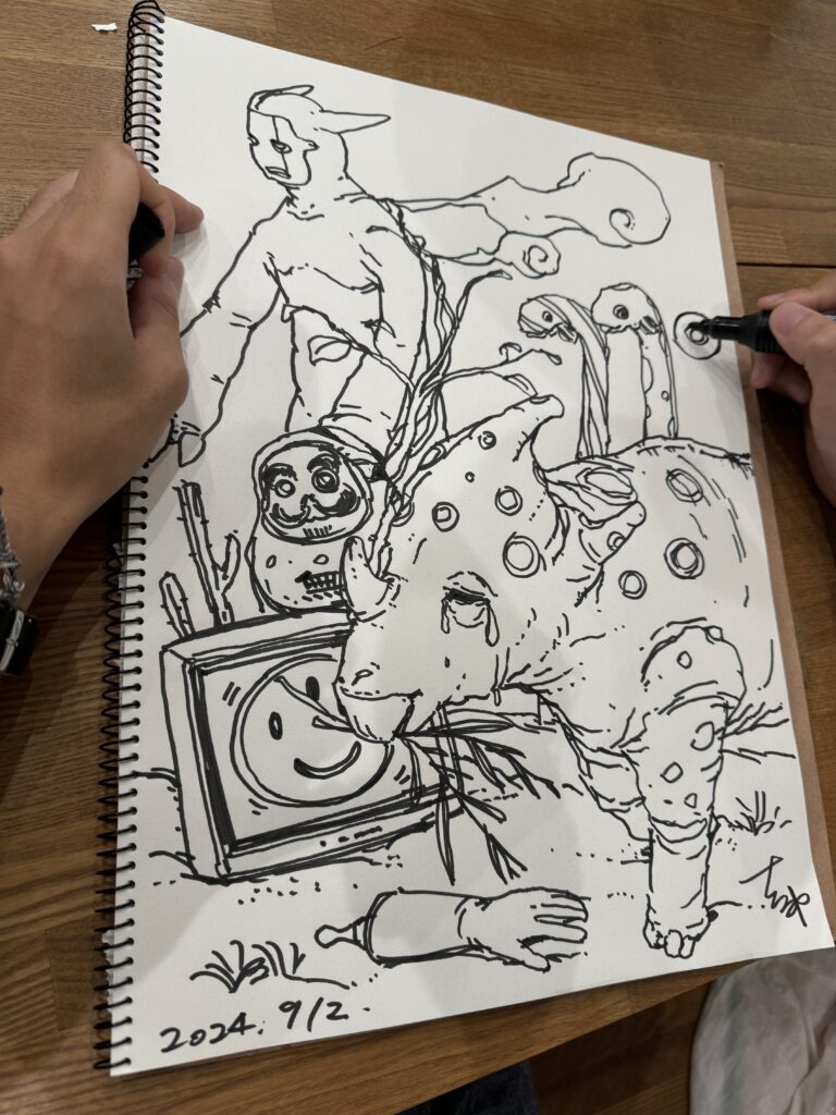 年中ネタに飢えている漫画家と編集者が、次回作の打ち合わせをしているかに見せかけた雑談を交わすーーそんなコンセプトで2024年の展示で始まった伝説のライブペイント。