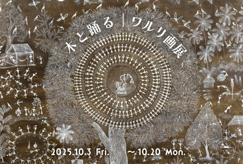 インド、マハラシュトラ州の森に住む先住民、ワルリ族。彼らは祭壇を持たず、結婚式や祭祀のときは、家の壁に米粉で神殿の絵を描き、シャーマンが祈り、神様を迎えます。そんな祈りの壁画から始まっているワルリ画には、自然を畏れ、敬う一方でのびのびと謳歌する彼らの思想と哲学がこめられています。